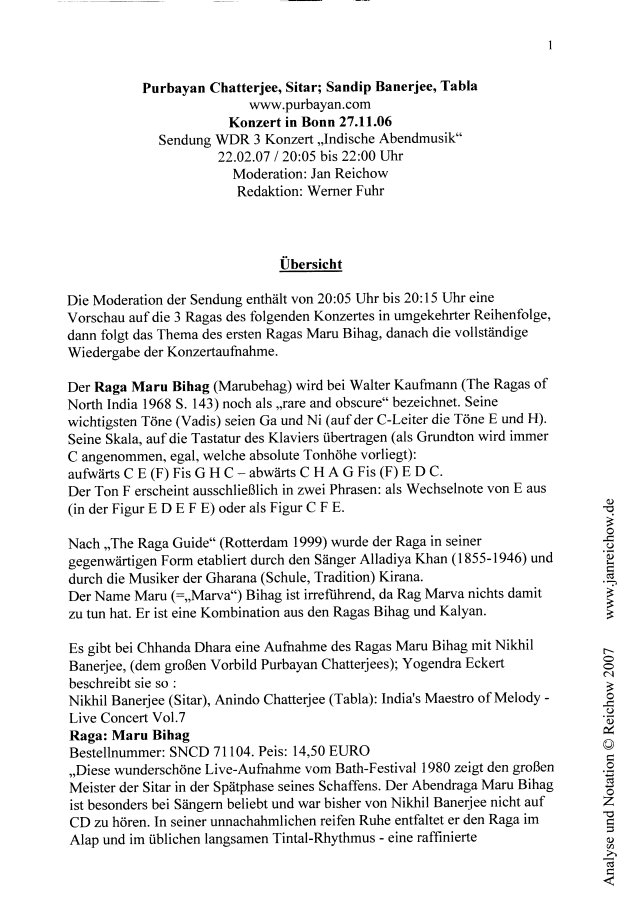 WDR 3 Konzert. Sie hörten eine Indische Abendmusik mit dem Sitar-Virtuosen Purbayan Chatterjee und Sandip Banerjee an den Tabla-Trommeln; zuletzt erklang der Raga Sohani, aufgenommen am 27. November 2006 im Bonner Pantheon.