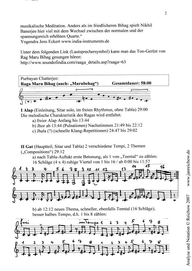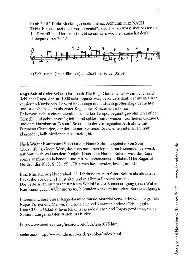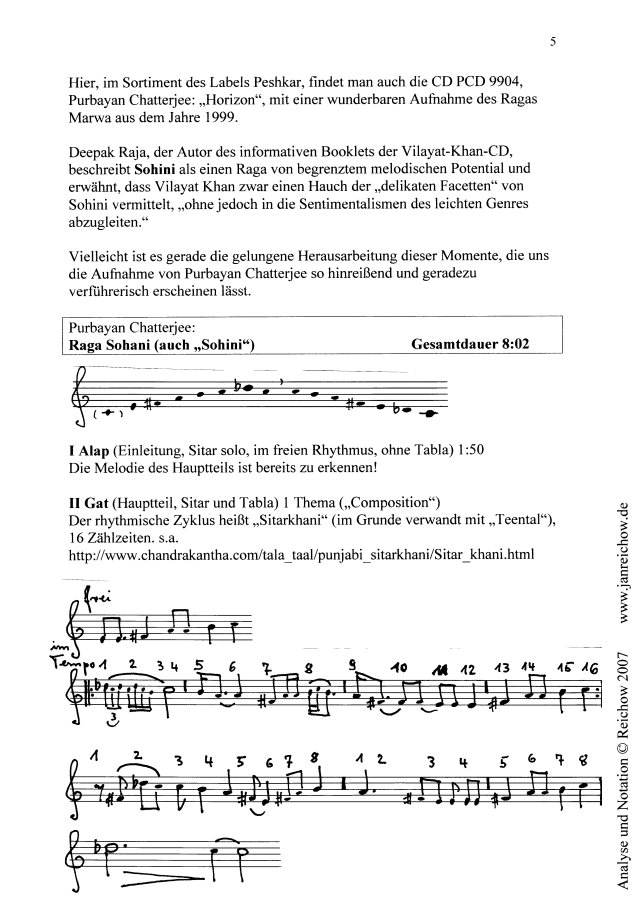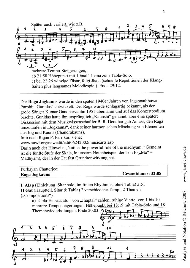 Ergänzende Übersicht sowie Analysen und Notationen Anmerkung: ergänzendes Material [Grafiken in neuem Fenster]: Vorbemerkung Was ich in der Sendung nicht sagen konnte: sie enthält eine der schönsten Aufnahmen indischer Musik, die mir in den letzten Jahren begegnet ist.Es war eine reine Freude, täglich hineinzutauchen, - verbunden mit einer merkwürdigen Erfahrung, dass nämlich das Konzert, das ich im Bonner Pantheon ja unmittelbar erlebt hatte, sich im Nachhinein ständig vertiefte und fortwährend neue Perspektiven eröffnete, ohne an Lebendigkeit zu verlieren. Im Gegenteil. Ich habe nun versucht, es nicht bei der bloßen Begeisterung zu belassen, sondern das konkret Erklingende auch, soweit es mir zur Zeit (ohne weitere Rücksprache mit den Interpreten) möglich war, zu analysieren und zu "verschriftlichen". Ich halte diese Arbeit nicht für lebensfeindliche Vivisektion. Man darf dabei nur nicht vergessen, dass all dies live gespielt wurde, mit allen Qualitäten einer im Augenblick produzierten und wirkenden Musik, also einer Musik, die nicht nach der schriftlichen Form verlangt, nicht als "Werk" oder "Opus" überdauern will. Andererseits folgt sie Rahmenbedingungen des Ablaufs, der Tradition, der Improvisation und der Instrumentaltechnik, die durchaus im Verständnis der Musiker und der gebildeten Zuhörer derart objektiviert sind, dass sie ohne weiteres auch in schriftlicher Form darstellbar und daraufhin auch bis zu einem gewissen Grade lernbar wären, - wenn auch die mündliche Form des Lehrens und Lehrens, wie in Indien üblich, bei weitem vorzuziehen ist. So ist es auch nicht verwunderlich, dass die in westlicher Notenschrift notierten Themen nichts, aber auch gar nichts von ihrer Eignung, ihrer Schönheit oder oder ihrer "Perfektion" verraten, wenn man sie nur gelesen, nie gehört hat. Man braucht die Vorstellung ihrer klingenden Gestalt. Die Schrift dient nur der Identifizierung, ist nichts als eine Erinnerungshilfe.Aber für den, der in der westlichen Notation zu Hause ist, ist sie trotzdem - wie ich finde - viel sinnlicher und aussagefähiger als die Buchstaben-Notation, die man in vielen Büchern zur indischen Musik findet. Wichtig ist es auch, den Tala, den rhythmischen Zyklus, zu realisieren: es wirkt leider unangenehm dozentenhaft, wenn in der Sendung ein solche rhythmische Periode von 1 bis 16 oder von 1 bis 10 vorgezählt wird, aber man versteht indische Musik nicht zureichend, wenn man nur darin "schwimmt", ohne ein Boot oder eine Boje in der Nähe zu wissen. Skript der Sendung Sie hören eine Indische Abendmusik mit dem Sitar-Virtuosen Purbayan Chatterjee, aufgenommen am 27. November 2006 im Bonner Pantheon. Eine Veranstaltung der Deutsch-Indischen Gesellschaft Köln-Bonn in Zusammenarbeit mit WDR 3.