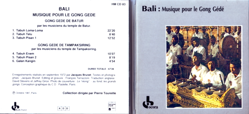 "Das kommt von den Fremden. Sie lieben das, was glänzt, was schnell geht, und die Balinesen verdienen auf diese Weise Geld. Aber ich, ich kann nur für mich spielen, um mich glücklich zu machen. Und dann, - so kann ich den Gong hören (er wandte sich zum großen Gong seines Gamelan zurück). Hören Sie, wie gut er klingt! Er ist das Gegenteil von mir, je älter er wird, desto schöner und dunkler wird sein Ton.(...) Mein Leben ist jetzt einfach, jeden Tag esse ich, geh ich spazieren, schlafe ich, esse ich, geh ich spazieren, schlafe ich...(er dachte einen Moment nach, dann streichelte er den Rand des Gongs)...Aber er singt noch immer, hören Sie, wie er atmet! (Er klopfte mit seinem Knöchel dagegen und ließ eine Reihe von Klangwellen im Raum widerhallen) Es gibt nichts Schöneres, nicht wahr?! Die Stimme der Geister. Aber er ist auch das Herz meines Gamelan-Ensembles. (Dann wendete er sich der Trommel zu) Und die hier", sagte er, "ist das Blut der Musik. Jedes andere Instrument spürt das, reagiert auf ihren Ruf. Schön ist das, schön ist die balinesische Musik..." (Zitat Booklet von Jacques Brunet, Übersetzung: JR)