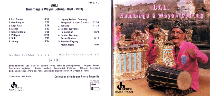 Ich habe hier eine Doppel-CD, deren Aufnahmen auf das Jahr 1972 zurückgehen: Bali / Hommage à Wayan Lotring. Es ist derselbe Meister, der den Wissenschaftler Colin McPhee bereits in den 30er Jahren fasziniert hatte. Der alte Mann musste 1972 mühsam überredet und ermutigt werden, noch einmal sein Ensemble zusammenzutrommeln und anzuleiten, die von ihm geschaffenen Werke zu spielen. Die Arbeit weckt ungeahnte Energien in dem 74jährigen. Er weiß, daß er die Chance hat, für die Nachwelt eine Art des Musizierens festzuhalten, die mit ihm verschwinden wird.
